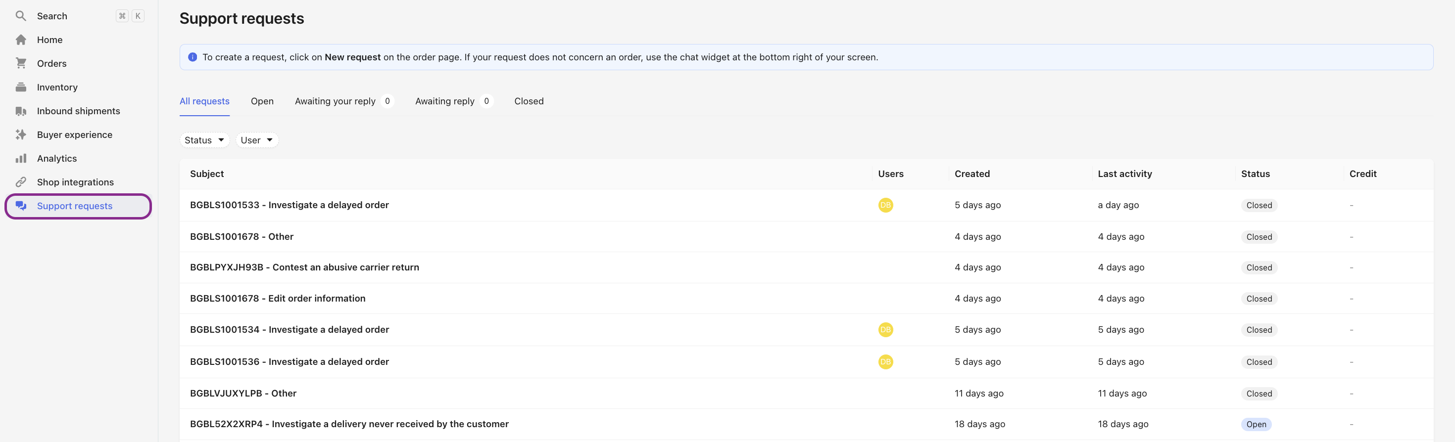 - All existing requests for this order will appear there along with their: request reason, status, last update time