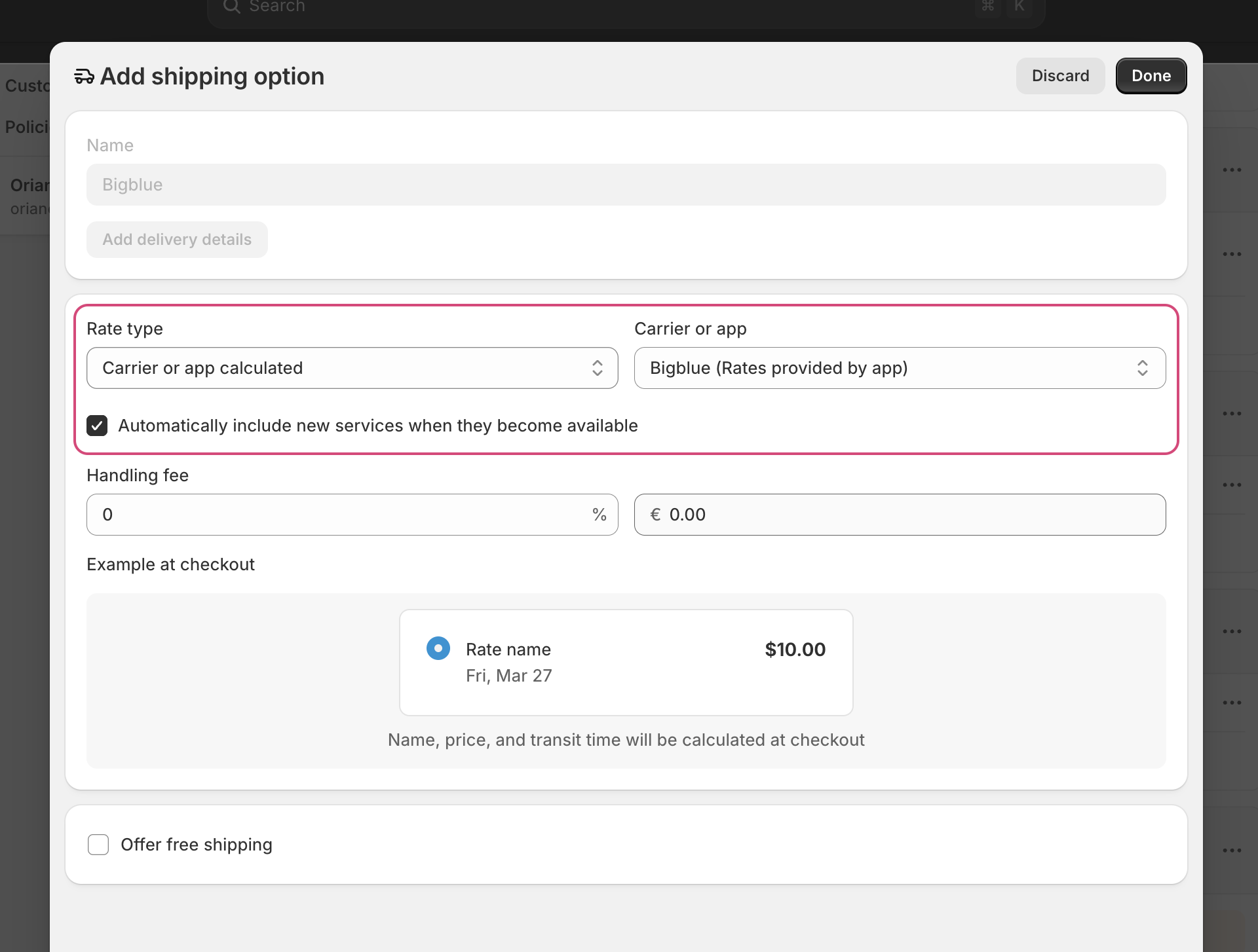- For each shipping zone, click on Add rate then in Rate type, pick Carrier or app calculated, choose Bigblue (Rates provided by app) and tick Automatically show new shipping services to customers when they become available