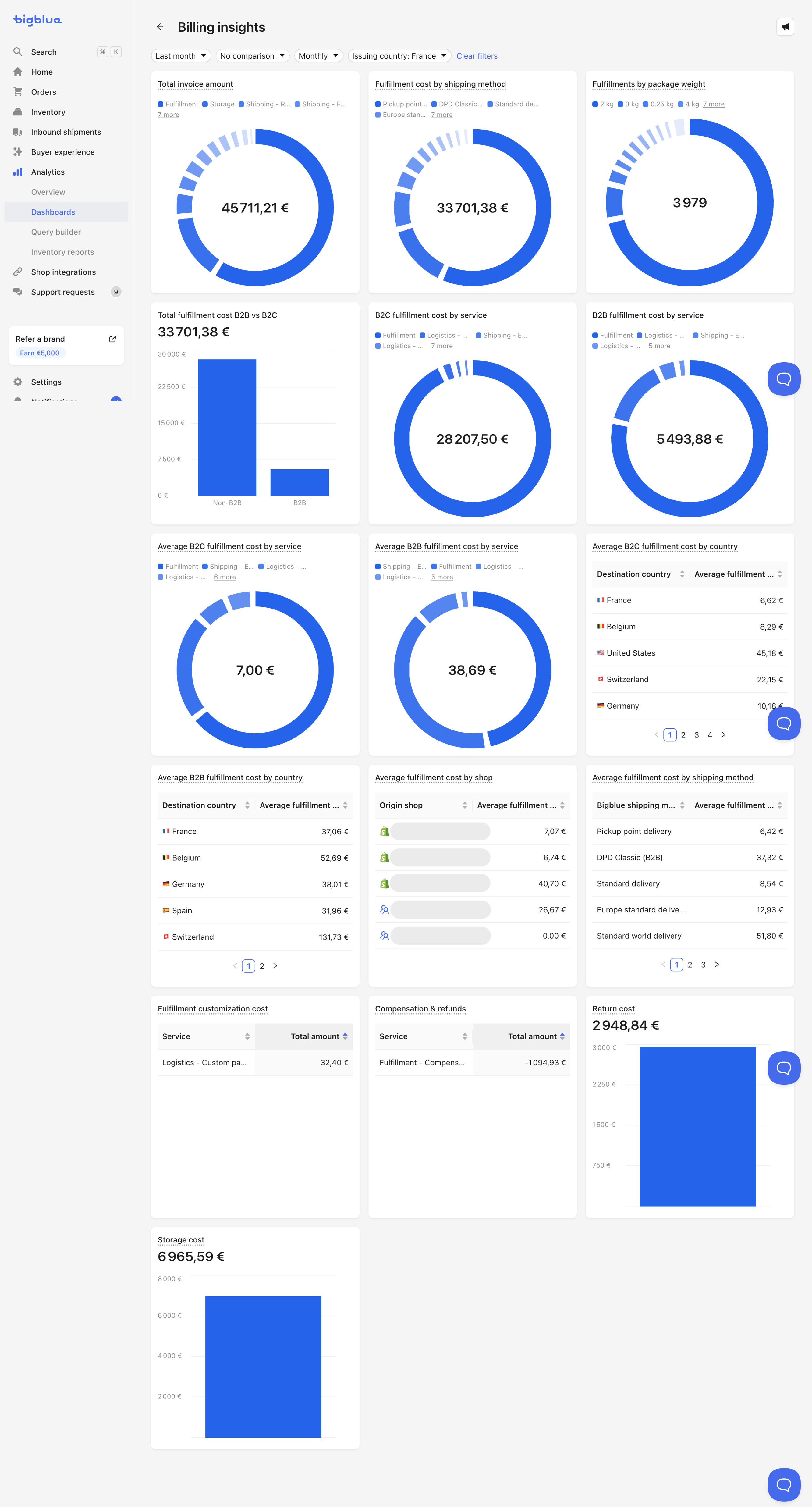 Bigblue provides pre-configured dashboards to help merchants monitor key business, logistics and operational metrics at a glance. Available dashboards are: