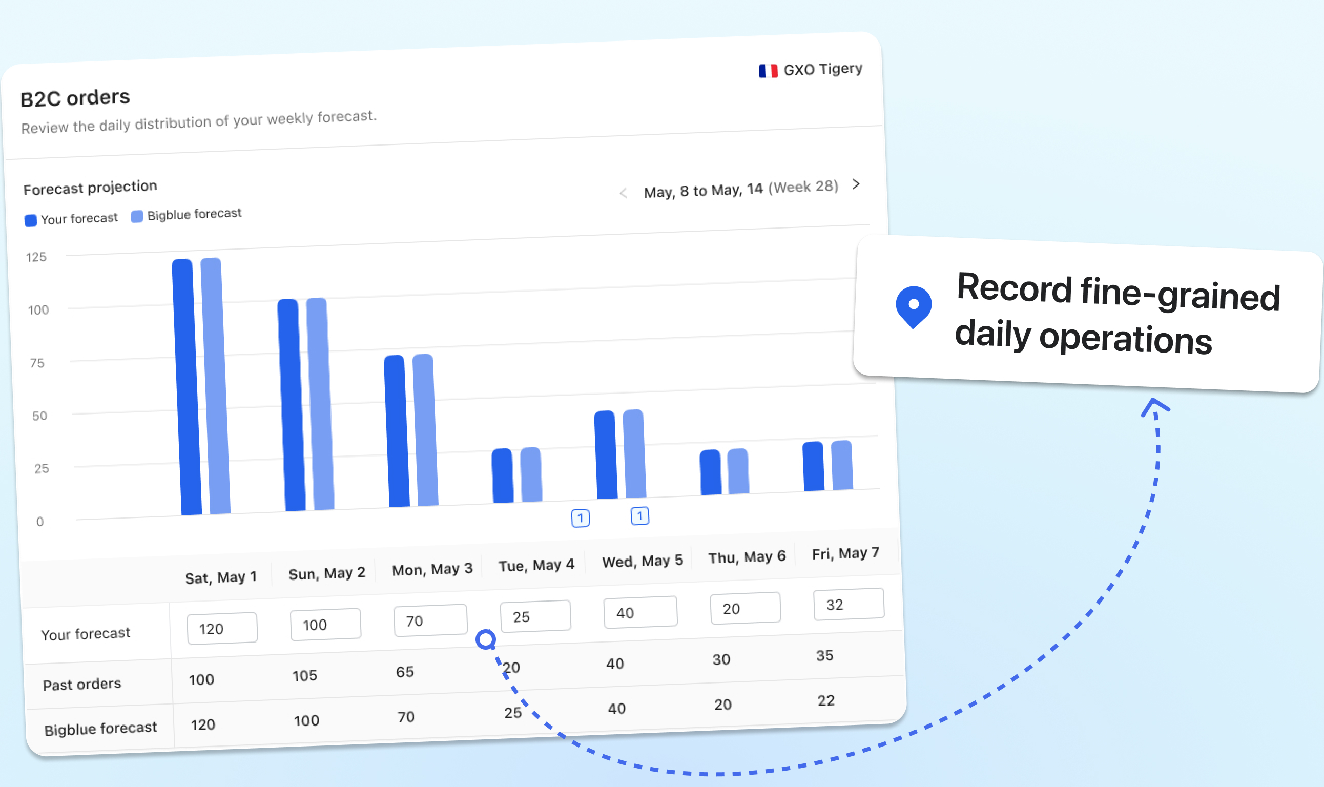 - Optional: Record events on coming weeks, with a name and a description to help Bigblue understand your operations and staff warehouses accordingly.
