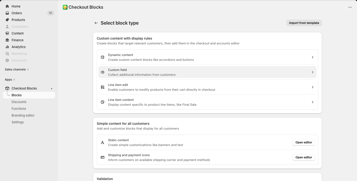 - Go to Shopify Admin > Checkout Blocks > Blocks, and click Create Block