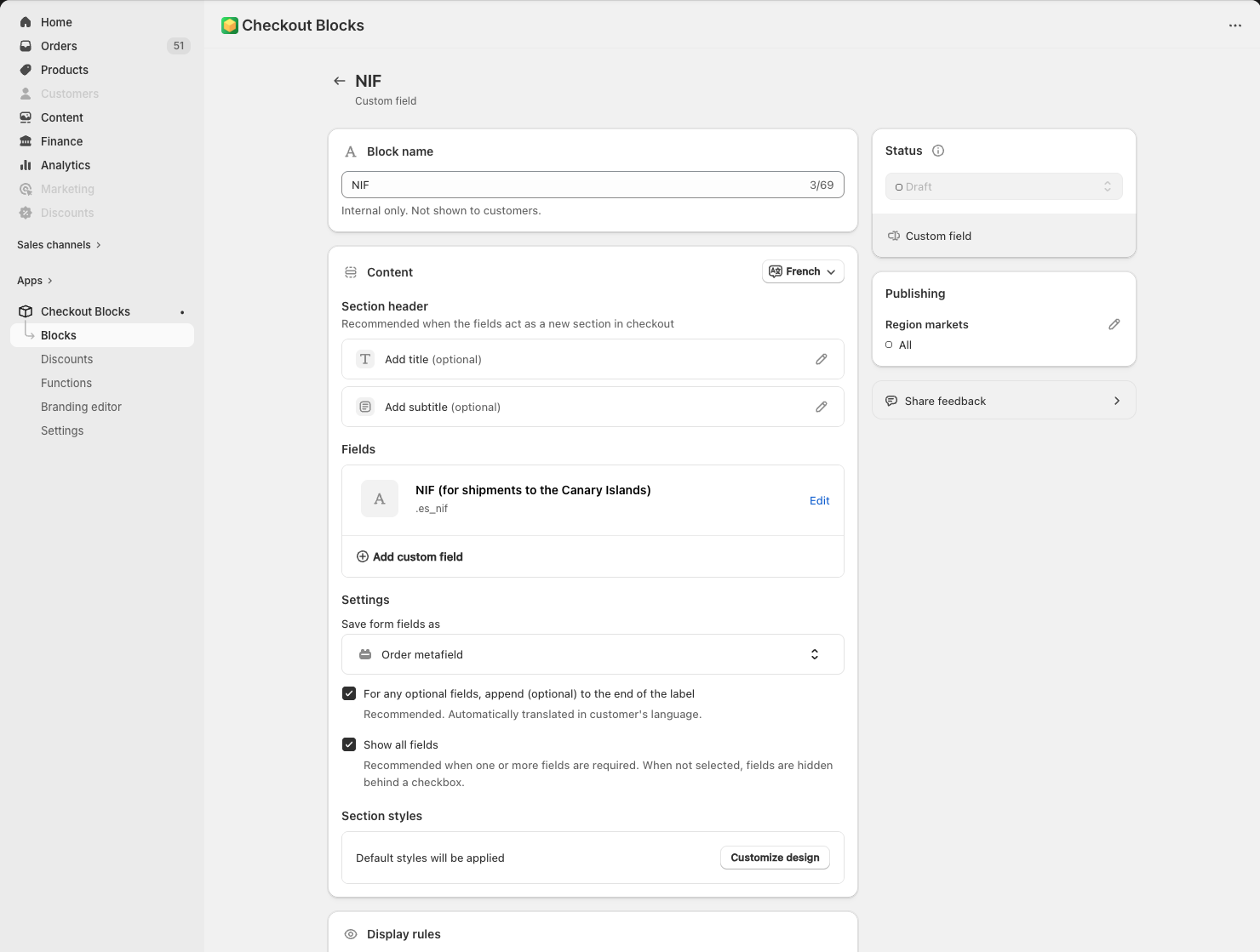 - In Field label, input what your buyers should see, e.g. "NIF (for shipments to the Canary Islands)"
