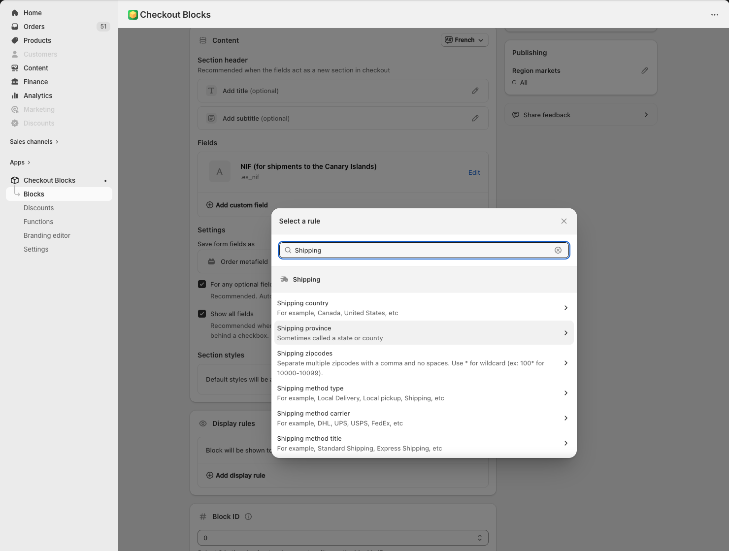 - In the Display rules section, click Add display rule, and in the modal, select Shipping province