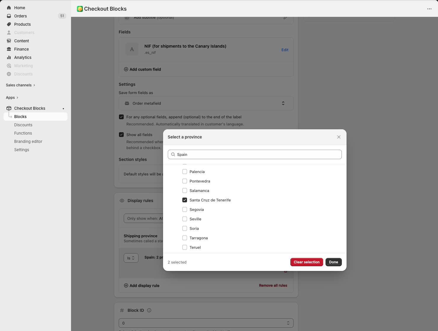 - In the Display rules section, click on Select a province and in the modal, search for Spain, show the full list, and select Las Palmas and Santa Cruz de Tenerife